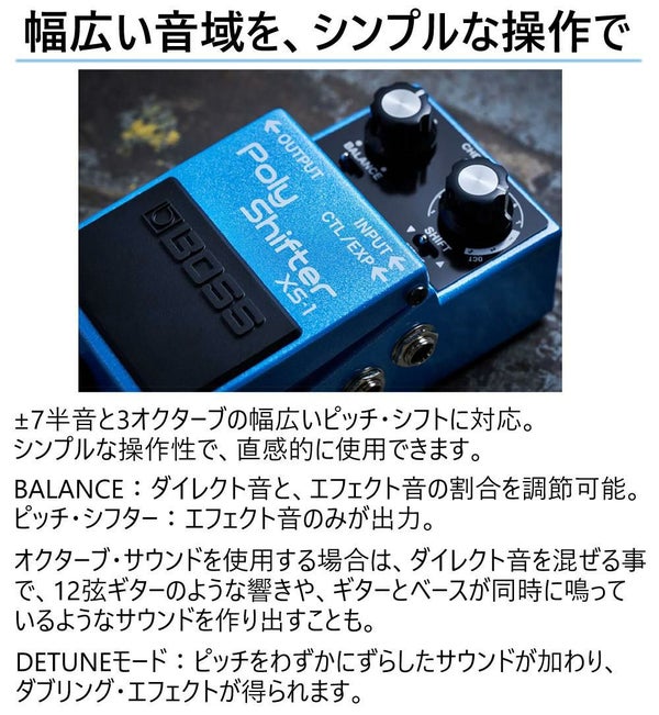 BOSS XS?1 Poly Shifter は、ギター/ベース用 コンパクト エフェクター で、±7 半音 と 3 オクターブ の ピッチシフト に対応し、BALANCE ノブ で 原音 と エフェクト 音 の ミックス 調整 が可能。モーメンタリ/トグル 切替、DETUNE モード、CTL/EXP 端子 による 外部コントロール 対応 など 操作 性 も 高く、ライブ 中 の チューニング 切替 を スムーズ に 実現。BOSS 独自 の 高度 アルゴリズム により、コード 演奏 や サスティン の 長い 音 でも 明瞭 な 音質 が 得られる。