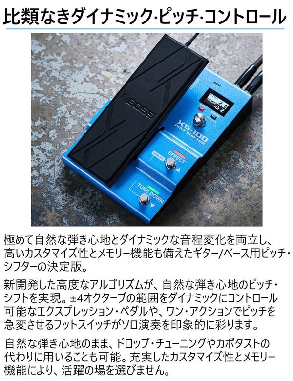 BOSS XS?100 Poly Shifter は ギター や ベース 用 の 次世代 ピッチシフター エフェクター です。 ±4 オクターブ の 音程変化 を エクスプレッション ペダル で自在に コントロール でき、EX P スイッチ に よる ワン アクション 操作 や DETUNE 機能 で 微妙 な揺らぎ を 加えることも可能です。内蔵 メモリー には 最大 30 セット の 設定 を 保存 でき、ライブ や スタジオ で 即時 呼び出し が 可能。MIDI 入出力 や USB 接続 に 対応 し、外部 フットスイッチ や 他 機器 との 連携 も 自由自在。トグル/モーメンタリ モード 切替 や カスタマイズ 性 に 優れ、従来 の ピッチシフター とは 一線 を 画す 自然な レスポンス と 表現力 を 実現 します。