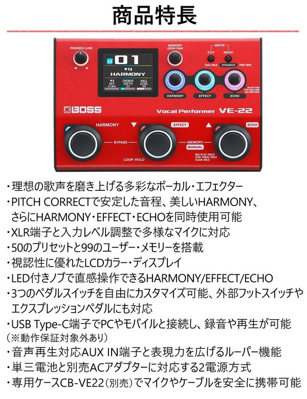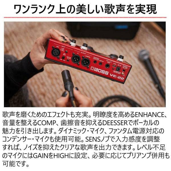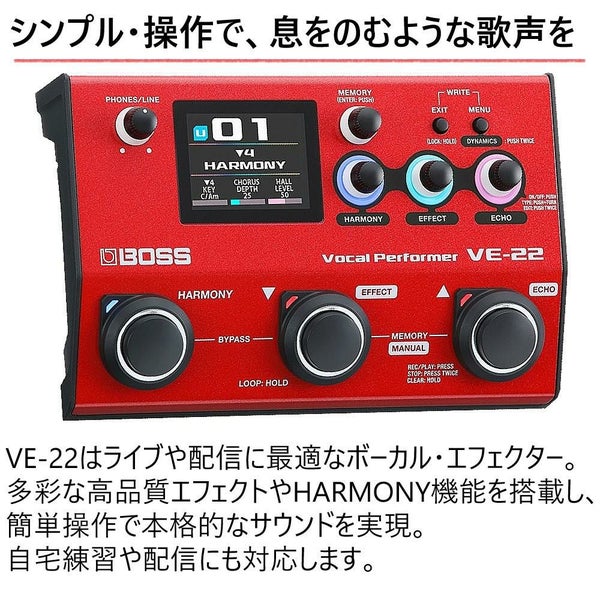 BOSSの技術を凝縮したVE-22は、リッチな残響やエレクトリック・ボイスなど多彩なエフェクトと、50種類の即戦力プリセットを搭載。