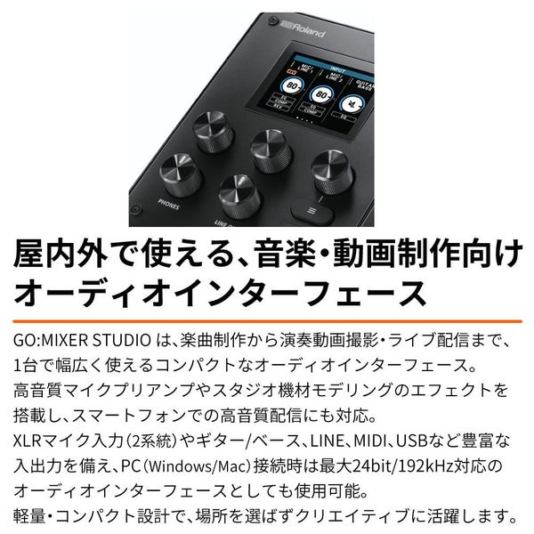 GO:MIXER STUDIO は、ホームスタジオでの楽曲制作・レコーディングからアウトドアでの演奏動画の撮影まで1台でこなせるコンパクトサイズなオーディオインターフェースです。