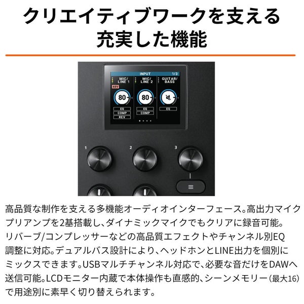 | 接続端子 | MIC/LINE(1、2)端子:XLR(ファンタム電源 DC48V、10mA) GUITAR/BASS 端子:標準タイプ(ハイ・インピーダンス対応) LINE IN(L、R)端子:標準タイプ AUX 端子:ステレオミニタイプ(TRRS) PHONES 端子:ステレオ標準タイプ PHONES(MINI)端子:ステレオミニタイプ(CTIA、プラグイン・パワー対応) LINE OUT(L、R)端子:標準タイプ MIDI(IN、OUT)端子:ステレオ・ミニ・タイプ USB 端子:USB Type-C(USB Audio Class 2.0/1.0、MIDI) POWER 端子:USB Type-C |