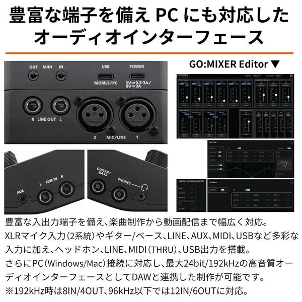 加えて GO:MIXER STUDIO は PC(Windows/Mac)接続にも対応。24bit/192kH 対応、12IN/6OUT(192kHzの場合は8IN4OUT)の高品位なオーディオインターフェースとして使用可能です。