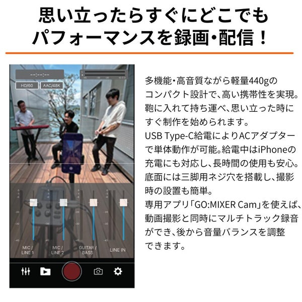 スマートフォンで高音質のライブ配信/動画撮影が手軽に行える小型ミキサーとして好評の GO:MIXER シリーズが更に進化。高音質マイクプリアンプを搭載し、スタジオ機材モデリングのエフェクト機能などの多彩な機能が追加されました。