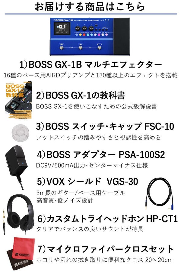 BOSS GX-1B は ベース 用 マルチエフェクター で 軽量 コンパクト な ボディ に 16 種類 の AIRD プリアンプ と 130 エフェクト を 搭載 し 直感 操作 可能 な カラー ディスプレイ と GEAR SUITE 機能 で サウンド メイク が しやすい USB Type-C 録音 Bluetooth 接続 専用 アプリ BOSS TONE STUDIO 対応 で 練習 ライブ 録音 に 最適 です 99 プリセット と 99 ユーザーメモリー で 音色 保存 も 自由 に 行えます