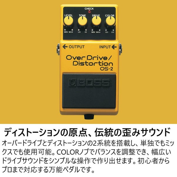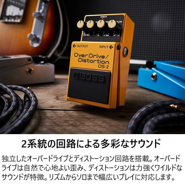 BOSS OS-2 エフェクター は オーバードライブ と ディストーション を1台に搭載した ギターエフェクター です。 歪みペダル として 幅広い サウンドメイク が可能で、 COLORノブ により ドライブペダル のバランス調整も簡単。 LEVEL TONE DRIVE の操作で 中域豊かな オーバードライブ から 力強い ディストーションサウンド まで自在に再現します。 コンパクトペダル で扱いやすく、 初心者 から プロ まで対応。 バッファードバイパス 採用で安定した音質を実現し、 ライブ機材 や スタジオ機材 としても活躍する ギター用エフェクター です。
