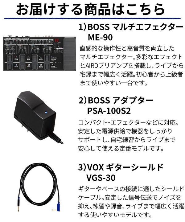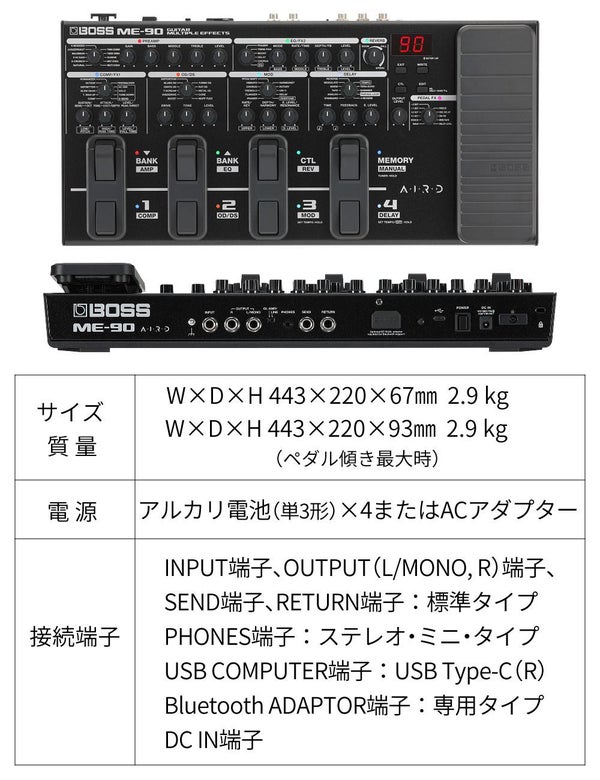 BOSS ME-90 は、 ギター 用 の マルチエフェクター として、 直感的 な ノブ 操作 と 8つ の フットスイッチ で 快適 な 音作り を 実現します。 AIRD プリアンプ 11種類 と エフェクト 97種類 を 搭載し、 GT-1000 譲り の 高品位 サウンド に 対応。 MEMORYモード や MANUALモード、 ルーパー、 SEND RETURN、 IRデータ 取り込み、 BOSS TONE STUDIO による パッチ管理 も 可能で、 ライブ から 自宅録音 まで 幅広く 活躍する ギターエフェクター です。