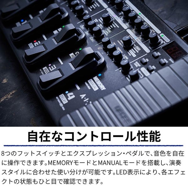 パッチを切り替えるMEMORYモードと、各エフェクトを個別にON/OFFできるMANUALモードを搭載し、演奏スタイルに合わせた操作が可能です。