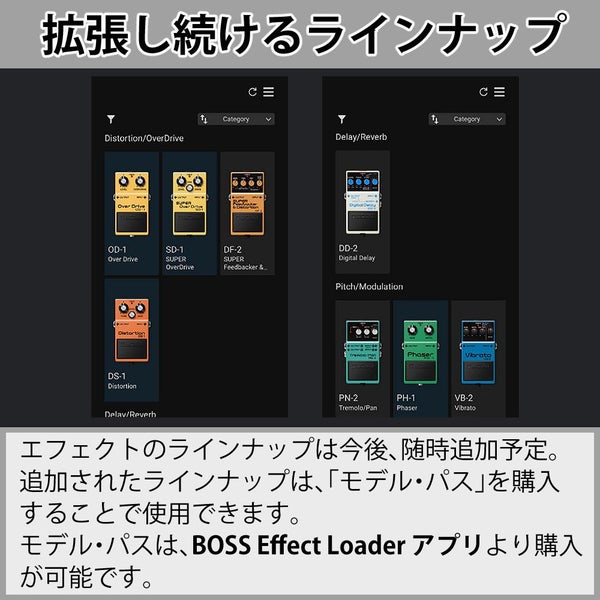 エフェクトのラインナップは今後、随時追加されていきます。追加されたラインナップは、「モデル・パス」を購入することで使用できます。モデル・パスは、BOSSEffectLoaderアプリより購入が可能です。