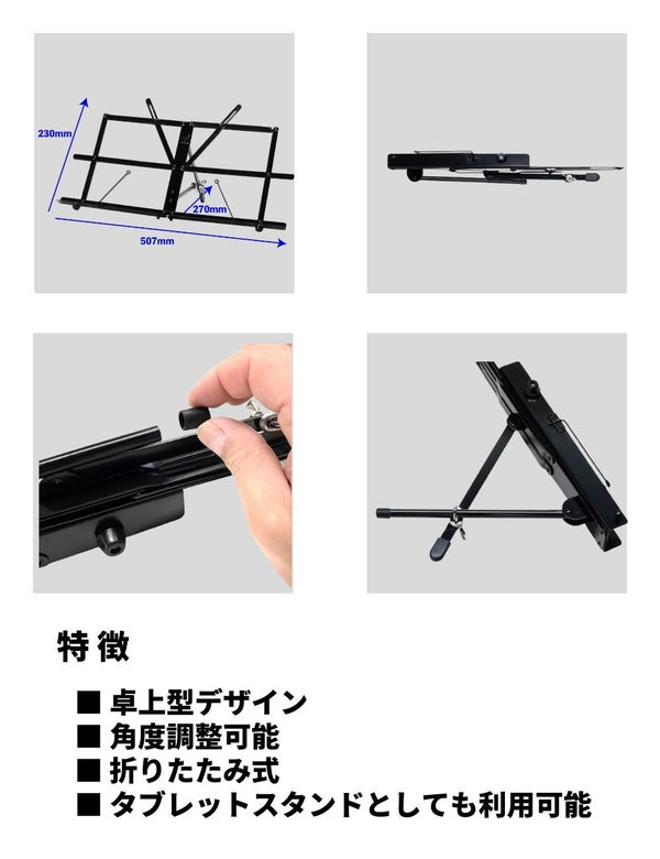 ■ 角度調整可能:譜面やタブレットを最適な角度に調整でき、快適な視認性を確保します。