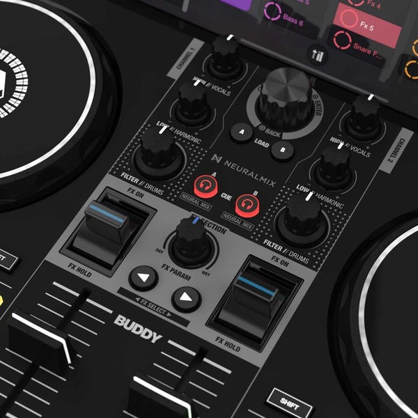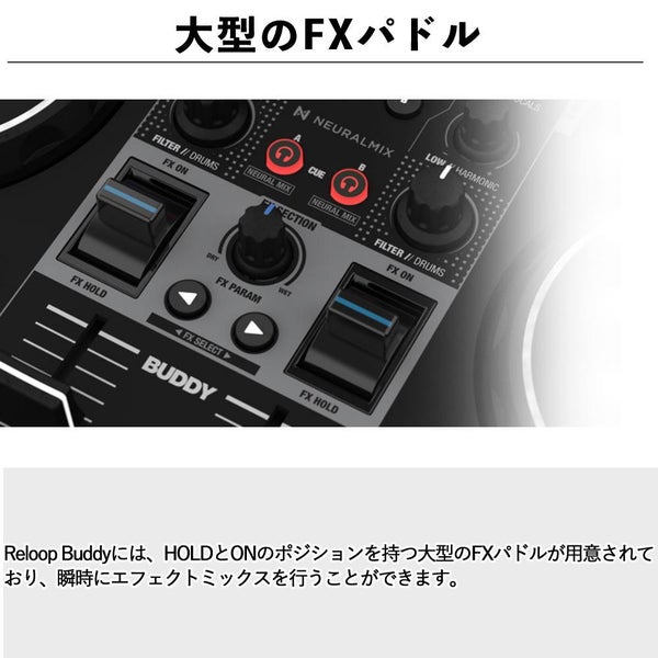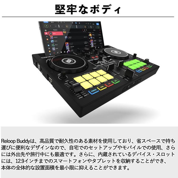 Reloop Buddyは、Algoriddim社との共同開発により、もはやスタンダードとなったDJアプリ「djay」との緊密な連携を実現した、コンパクトでパワフルなdjay専用2チャンネルDJコントローラーです。
