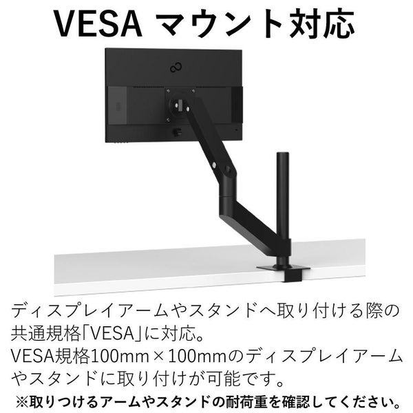VESA規格100mm×100mmのディスプレイアームやスタンドに取り付けが可能です。