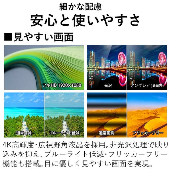 光の反射を抑え、映り込みの少ない非光沢処理や、ブルーライトカット眼鏡が不要なブルーライト低減機能、画面のチラツキを抑えるフリッカーフリー機能も備え、目に優しく見やすい画面を実現。