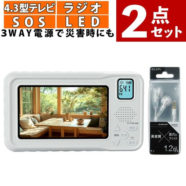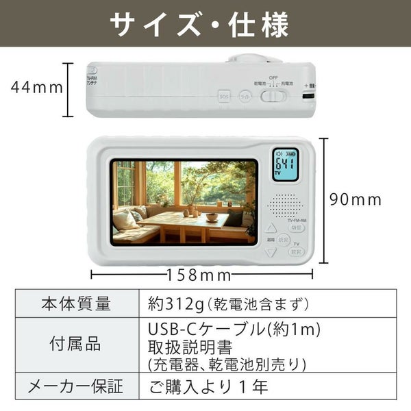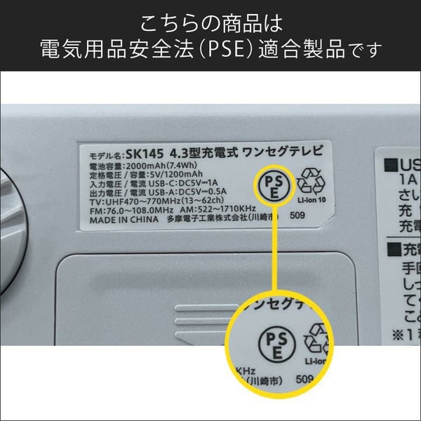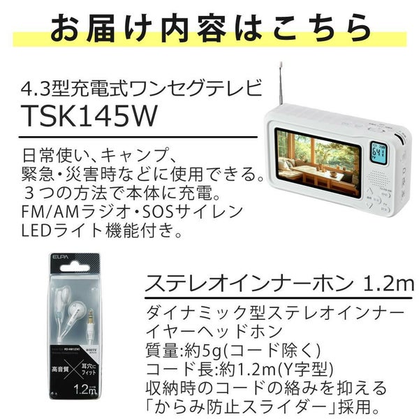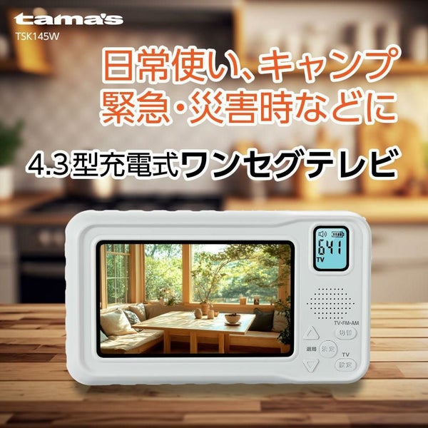 検索ワード:多摩電子工業 TSK145W ワンセグテレビ 4.3型 ラジオ LED 手回し充電 災害 日常使い AM FM 家庭用 イヤホン イヤーヘッドホン
