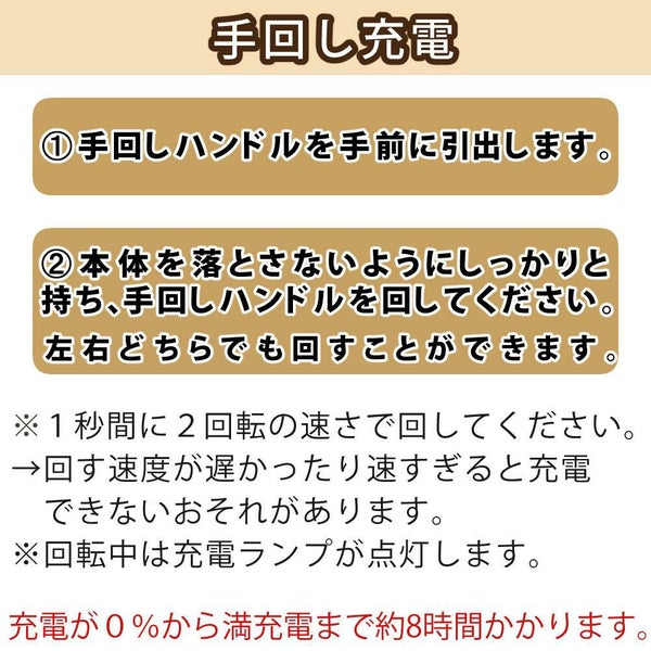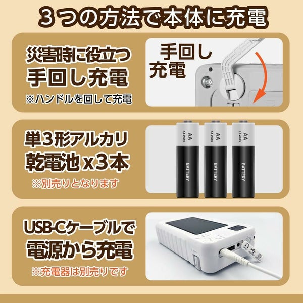 (災害時に役立つ手回し充電・単三形アルカリ乾電池×3本・USB -Cケーブルで電源から)