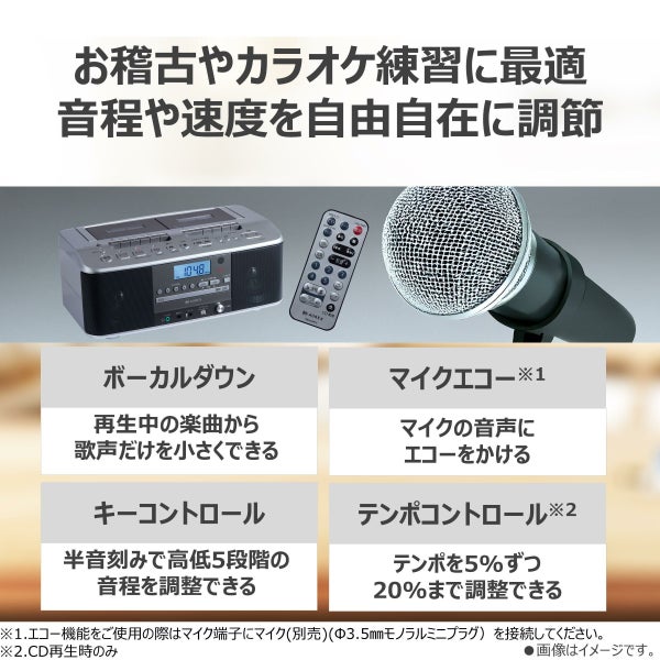 cdラジカセ ダブルカセット 搭載 の cdラジオカセット は カセットテープ から カセットテープ へ の 高速 テープダビング や cd録音 ラジオ録音 が 可能 な 多機能 cdプレーヤー 。 カラオケ 練習 に 便利 な ボーカルダウン マイクエコー キーコントロール テンポコントロール を 搭載 し 自宅 で 本格的 な カラオケ機能 を 楽しめます。 cdラジオ と カセットプレーヤー を 1台 に 集約 した cdラジオレコーダー は マイク入力 や デュエット 対応 で お稽古 や 練習 にも 活躍。 リモコン付き で 操作 しやすく レジューム再生 フルオートストップ など 便利 機能 も 充実 した ポータブルオーディオ です。