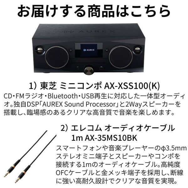 東芝 ミニコンポ AUREX AX-XSS100(K) ブラック は、CD・USB・Bluetooth・ワイドFMラジオ に対応した 一体型 の ハイレゾ対応 ミニコンポ です。独自の AUREX Sound Processor 搭載 で 音源を 192kHz/24bit 相当に アップコンバート し、ツイーターとウーファー による 2Way スピーカー で 豊かな 音場を 再現。リモコン や スリープタイマー、外部入力 も 備え、リビング や 寝室 で 快適 に 音楽 を 楽しめる コンポ です。