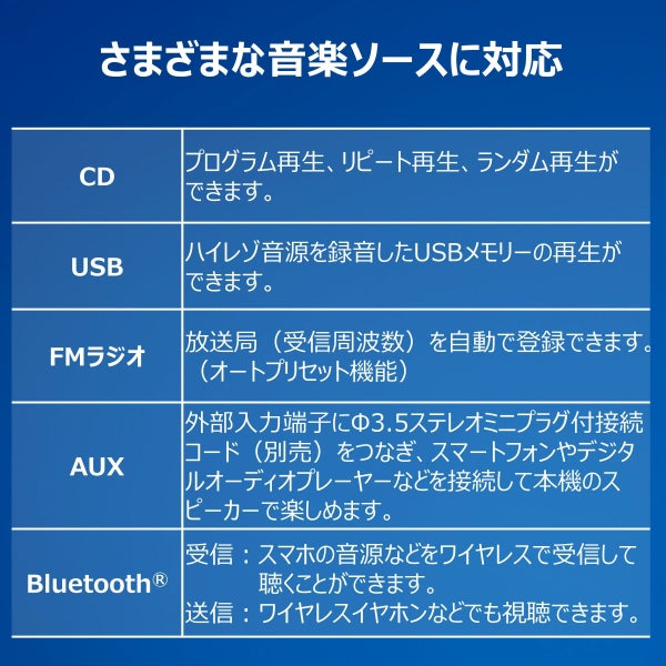 CD/USB/FMラジオ/AUX/Bluetooth(R)に対応