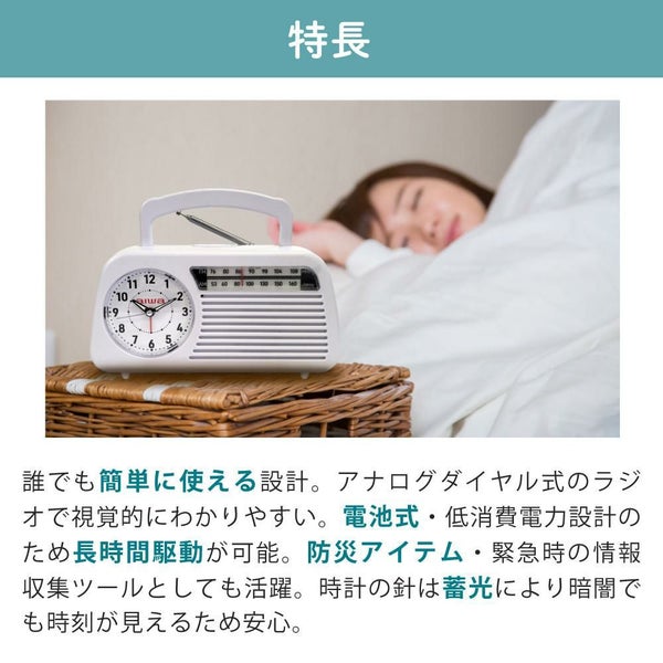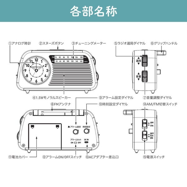 AM/FMラジオ、時計、アラームのシンプルな3つの機能のみを搭載した卓上ハンディラジオです。