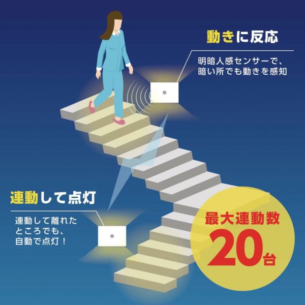 ●動きに反応。明暗人感センサーで、暗い所でも動きを感知。連動して離れたところでも、自動で点灯。