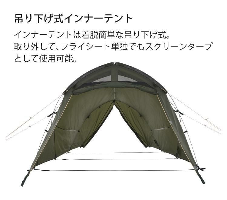 ・フライシート AIR INLET ROOF、防水加工(耐水圧1800mm)、撥水加工(3級以上)、難燃加工(米国基準CPAI-84適合)UV-CUT加工(90%以上)、SUPPORT BELT SYSTEM、ベンチレーション、バックドア、回転式ジッパー