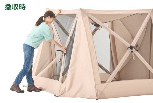 シートとフレームが一体化しているため、パネルを引っ張るだけで約90秒で設営ができる。