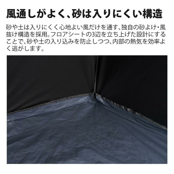 フロアシートの3辺を立ち上げた設計にすることで、砂や土の入り込みを防止しつつ、内部の熱気を効率よく逃がします。