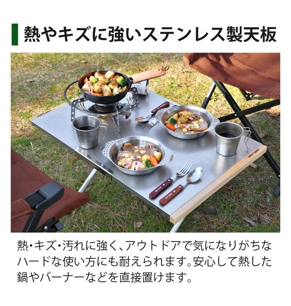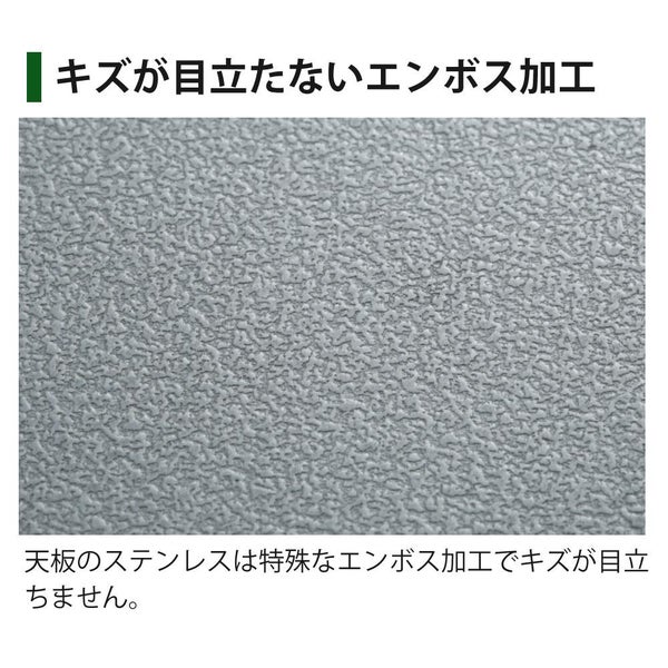 | 材質 | 天板:ステンレス鋼(特殊エンボス加工) サイド:天然木 スタンド:ステンレスパイプ直径19mm |