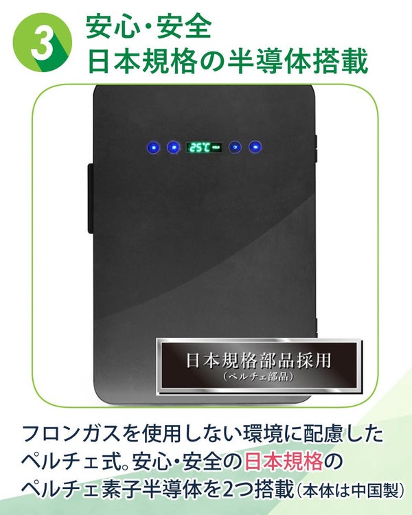 安心・安全の日本製ペルチェ素子半導体を2つ搭載(本体は中国製)。