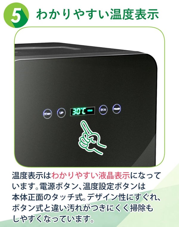 電源ボタン、温度設定ボタンは本体正面のタッチ式。