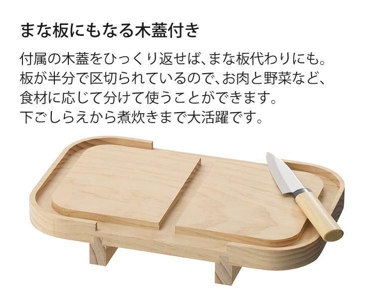 付属の木蓋をひっくり返せば、まな板代わりにも。板が半分で区切られているので、お肉と野菜など、食材に応じて分けて使うことができます。
