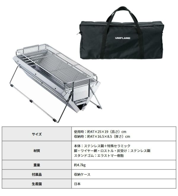 | 材質 | 本体:ステンレス鋼+特殊セラミック 脚・ワイヤー網・ロストル・灰受け:ステンレス鋼 スタンドゴム:エラストマー樹脂 |