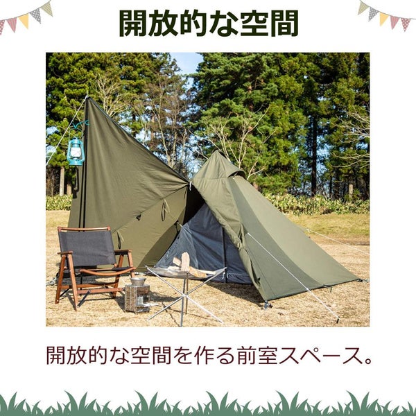 ポール一本で自立し、簡単に設営できるテントです。特にファミリーキャンプに最適です。