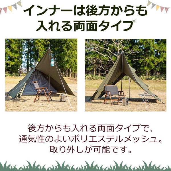 ベンチレーションがあり、テント内部の通気性が良く、快適な環境を保てます。インナーはポリエステルメッシュを使用し、後方からも出入りできる両面タイプです。インナーは取り外し可能です。