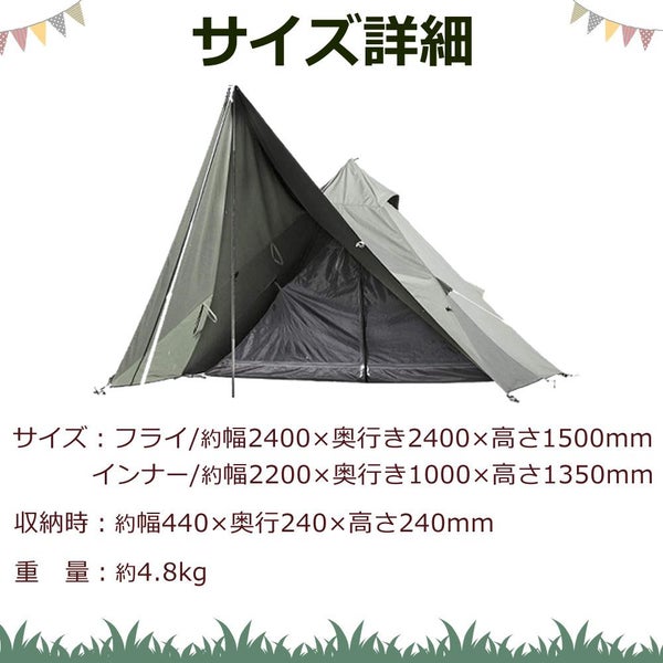 ※本製品はファミリーキャンプ用として設計されていますので、山岳キャンプや常設、日常使用には向きません。また、防水加工が施されていますが、完全防水ではないため、タープや防水スプレーを使用して追加の防水対策を行い、適切なお手入れを心掛けてください。必ず2名以上での組立を推奨します。