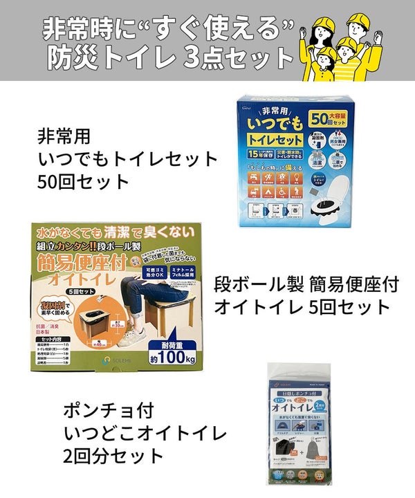 防災用品 トイレ3点セット は 非常用トイレセット として 使い捨てトイレ や 携帯トイレ を まとめて 備蓄 できる 人気 の 防災 グッズ です。 富士 useful の いつでもトイレ 50回セット は 簡易便座付きトイレ や 目隠しポンチョ付トイレ を 含み、 災害対策 や 緊急用トイレ の 必要性 に 応える 便利 で 清潔 な トイレ 非常用 用品 です。 アウトドア や キャンプ でも 活躍 する ポータブル トイレ セット で 保管 収納 も 容易 です。