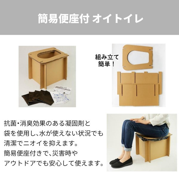 | セット内容 | 簡易便器枠(段ボール)×1、処理用袋×1、トイレ用袋×2、ポケットティッシュ×1、抗菌性凝固剤×2、ポンチョ×1 |