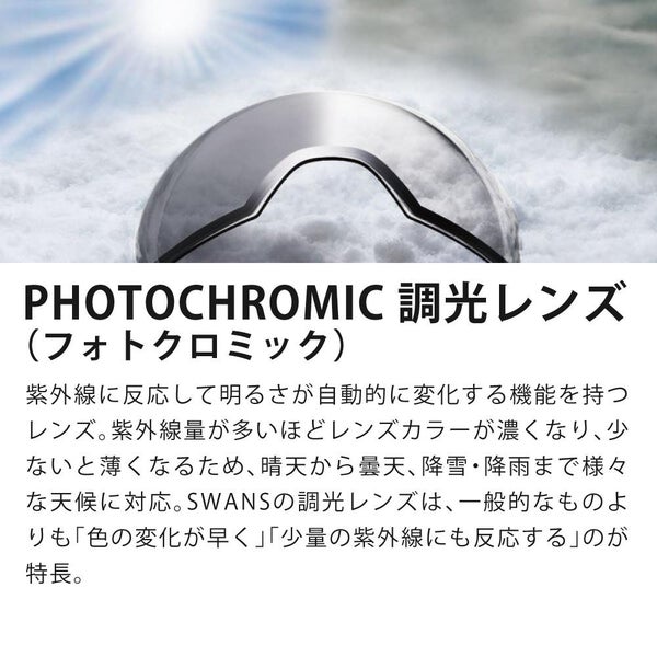紫外線に反応して明るさが自動的に変化する機能を持つレンズ。紫外線量が多いほどレンズカラーが濃くなり、少ないと薄くなるため、晴天から曇天、降雪・降雨まで様々な天候に対応。SWANSの調光レンズは、一般的なものよりも「色の変化が早く」「少量の紫外線にも反応する」のが特長。