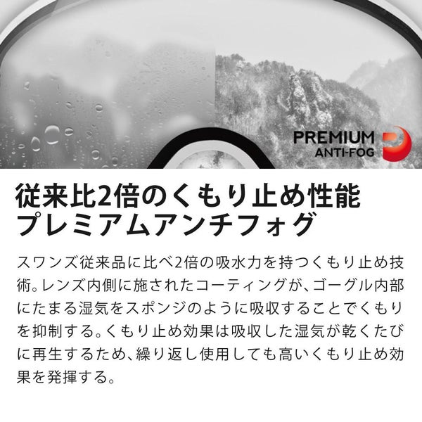 当社従来品に比べ2倍の吸水力を持つくもり止め技術。レンズ内側に施されたコーティングが、ゴーグル内部にたまる湿気をスポンジのように吸収することでくもりを抑制する。くもり止め効果は吸収した湿気が乾くたびに再生するため、繰り返し使用しても高いくもり止め効果を発揮する。