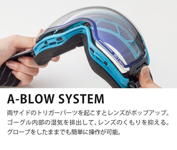 | フレーム機能 | A-BLOW SYSTEM 眼鏡併用可能 ヘルメット対応 超撥水レンズ ノンスリップストラップ ラウンドバックル(※別売ベルトクリップ:BH-12対応) |