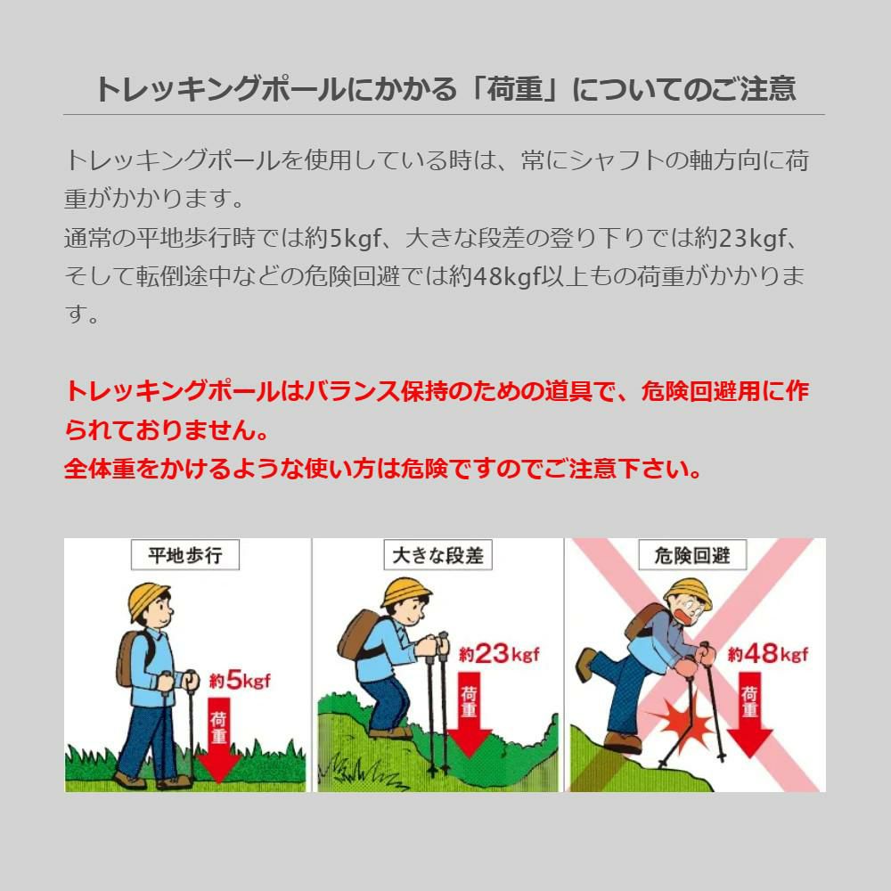 トレッキングポールを使用している時は、常にシャフトの軸方向に荷重がかかります。通常の平地歩行時では約5kgf、大きな段差の登り下りでは約23kgf、そして転倒途中などの危険回避では約48kgf以上もの荷重がかかります。トレッキングポールはバランス保持のための道具で、危険回避用に作られておりません。全体重をかけるような使い方は危険ですのでご注意下さい。