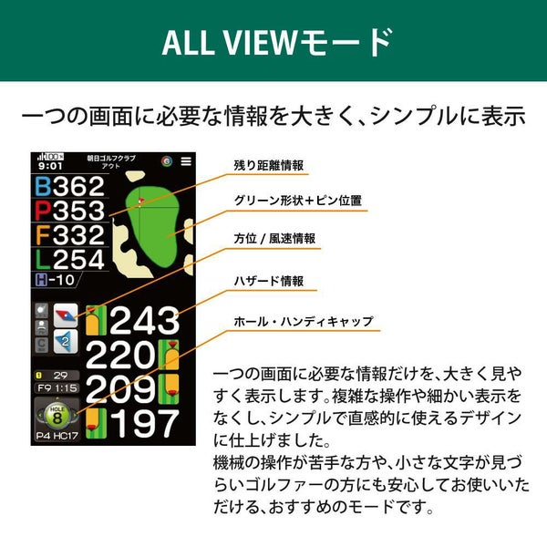 機械の操作が苦手な方や、小さな文字が見づらいゴルファーの方にも安心してお使いいただける、おすすめのモードです。