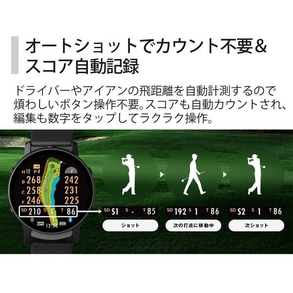 ドライバーやアイアンの飛距離を自動計測するので煩わしいボタン操作不要。スコアも自動カウントされ、編集も数字をタップしてラクラク操作。
