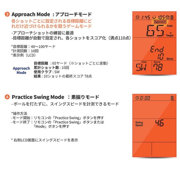 ・アプローチモード:毎ショットごとに指定される距離を狙うゲーム感覚の練習