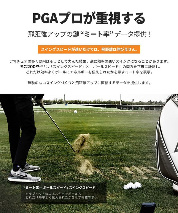 スイングスピードが速いだけでは、飛距離は伸びません。 アマチュアの多くは飛ばそうとして力んだ結果、逆に効率の悪いスイングになることがあります。 SC200 PLUS+ は「スイングスピード」と「ボールスピード」の両方を正確に計測し、 どれだけ効率よくボールにエネルギーを伝えられたかを示す=ミート率を表示。 無駄のないスイングづくりと飛距離アップに直結するデータを提供します。