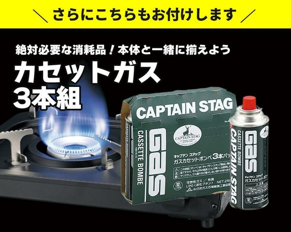 | 仕様/その他 | 火力/3.5kW(3000kcal/h)※1 ガス消費量(約)/250g/h ※1 点火方式/圧電点火方式 安全装置/圧力感知安全装置 使用ガス/プロパンガス 使用容器/M-7621キャップテンスタッグガスボンベ3本パック(1本250g) 使用時間/250g:約60分(容器1本) ※1 使用周囲温度20~25℃ガス消費量・使用時間は、表示火力にとづく理論値です。実際とは異なる場合があります。 |