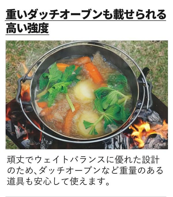 頑丈でウェイトバランスに優れた設計のため、ダッチオーブンなど重量のある道具も安心して使えます。