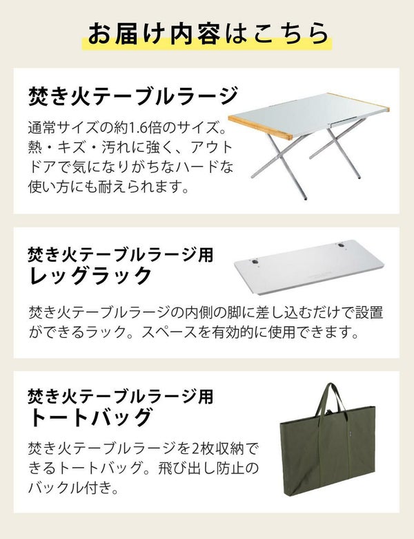 ガンガン使える頼もしいサイドテーブル 「焚き火テーブルラージ」に 専用の レッグラックと 収納バッグが付いた 3点セット