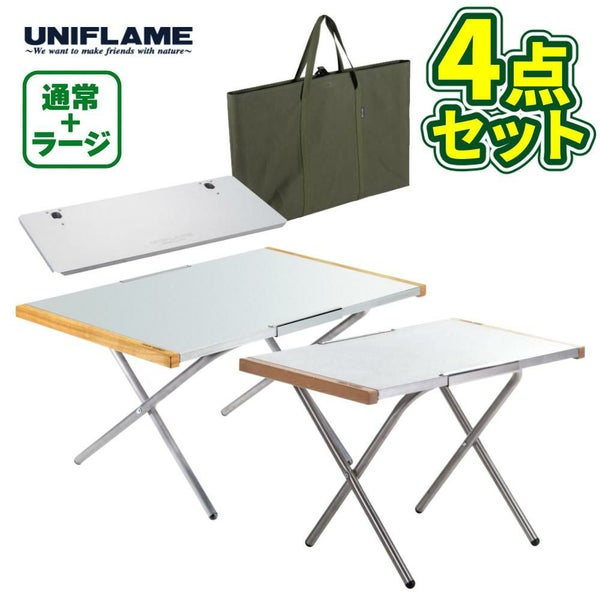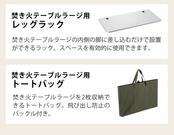サイズ違いの焚き火テーブルと ラージ用レッグラックと 収納バッグが付いた 4点セット