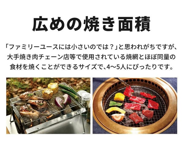 「ファミリーユースには小さいのでは?」と思われがちですが、大手焼き肉チェーン店等で使用されている焼網とほぼ同量の食材を焼くことができるサイズで、4~5人にぴったりです。