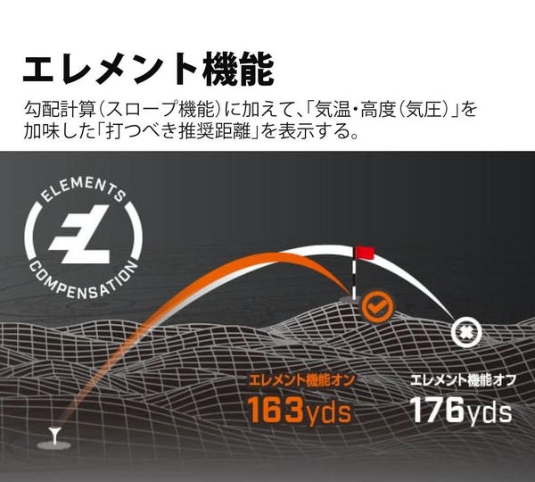 勾配計算(スロープ機能)に加えて、「気温・高度(気圧)」を加味した「打つべき推奨距離」を表示する。